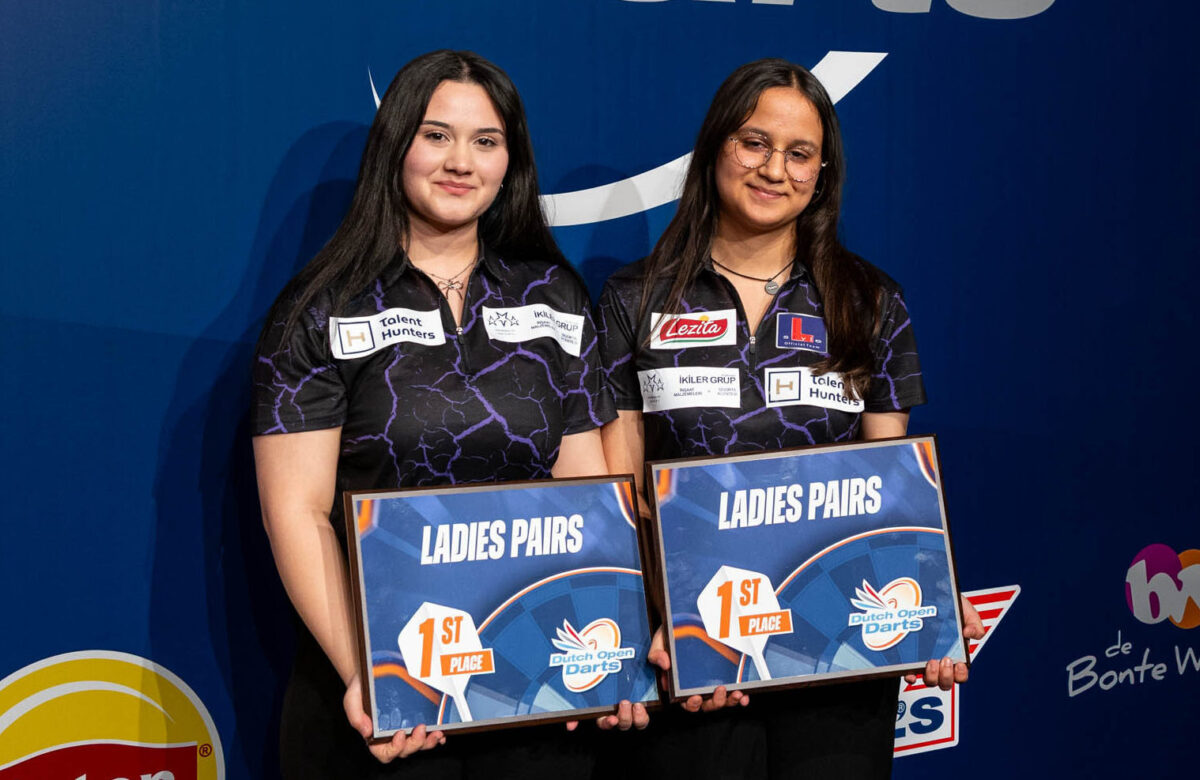 Ze hebben geschiedenis geschreven in Assen! Voor het eerst werd een Turks dameskoppel de winnaar van het koppeltoernooi van de Dutch Open Darts! En hoe; de zeer jonge dames Zehra Gemi (16 jaar) en Aysegül Karagöz (15 jaar) lieten gedurende het hele toernooi geweldig niveau zien! Op vrijdag al noteerden ze prachtige overwinningen, tegen onder meer Lotte Suomi en Milla Sainio (3-0) en tegen het ervaren Nederlandse duo Aileen de Graaf/Anca Zijlstra (3-1). De finale op het grote podium was relatief eenzijdig. Priscilla Steenbergen en Jo Rolls konden het spel van de Turkse dames niet bijbenen. Zehra en Aysegül wonnen met 4-1 en kroonden zich tot koppelkampioenen in de grote zaal van De Bonte Wever!