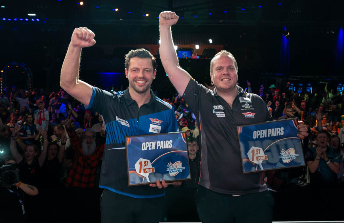 Het was op voorhand misschien wel de gedroomde finale! Dirk van Duijvenbode en Maik Kuivenhoven stonden op het grote podium in Assen op zondag tegenover Jimmy van Schie en Danny van Trijp. Wat een affiche, met deze vier topdarters in de eindstrijd! Dirk en Maik, samen al heel wat jaren professionals bij de PDC, liepen na twee legs weg bij Jimmy en Danny. Met sterk spel; veel 180’ers en goede finishes, wonnen zij de finale met 5-1 en sleepten zij de koppeltitel in De Bonte Wever binnen! Daarbij noteerden zij een gemiddelde van ruim 95 per beurt!