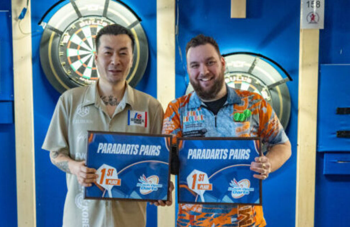 Ze mogen trots zijn op hun prachtige titel! Onze ervaren Nederlandse darter Michelovic van Velzen koppelde tijdens deze editie van de Dutch Open Darts met Kwanghee Cho uit Zuid-Korea! Kwanghee bewees zonder meer dat hij met een goede reden de lange reis naar Assen had gemaakt! Samen met Michelovic versloeg hij in de eindstrijd het Duitse duo Michel Holzen en Ralf Huesmann. Eenvoudig was dat nog niet; het werd uiteindelijk 4-2. Daarmee mogen Kwanghee en Michelovic zich het komende jaar Paradarts Pairs Champions van de Dutch Open Darts noemen!