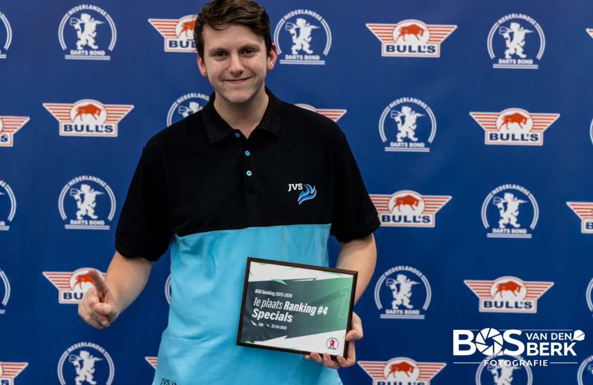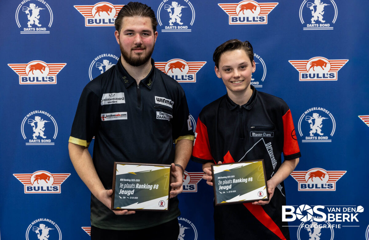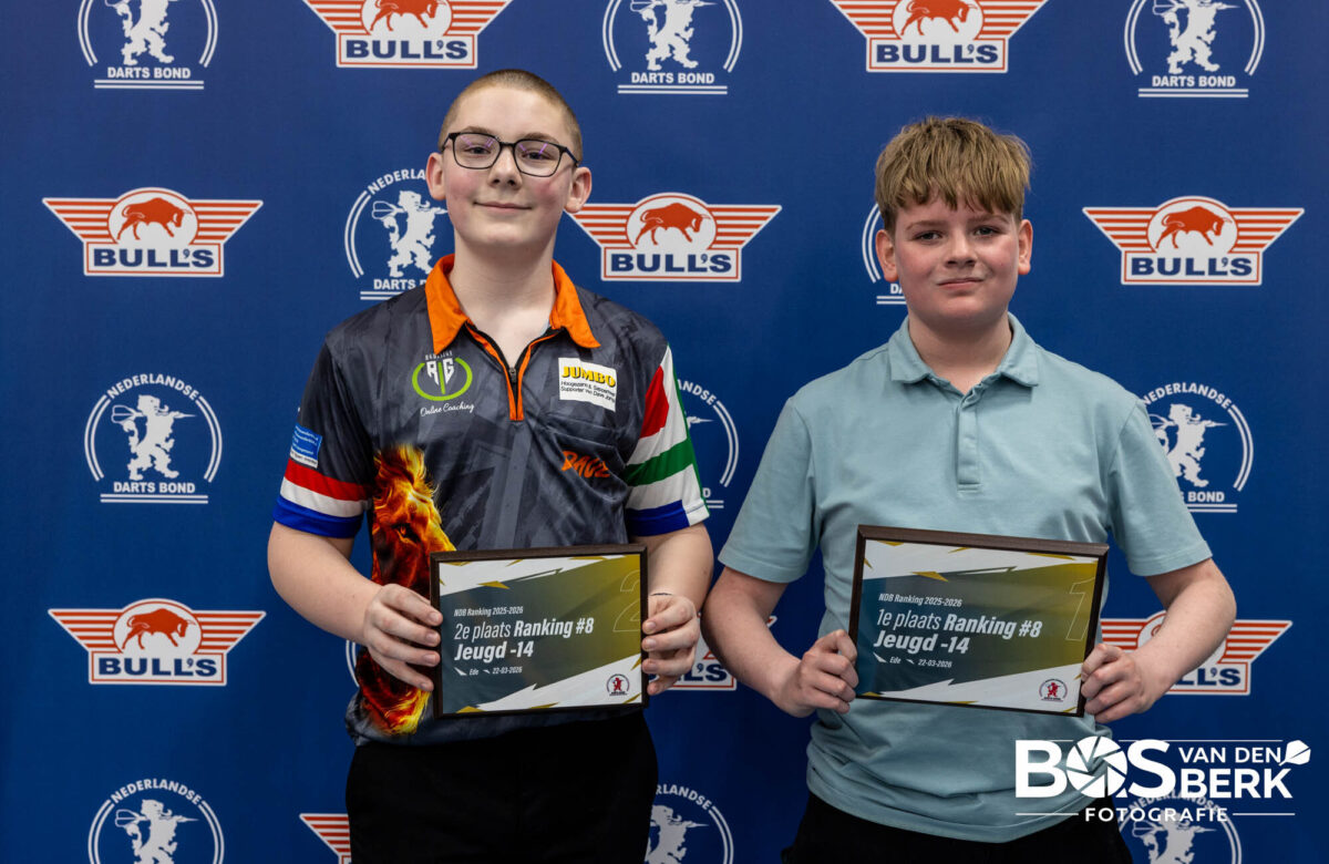 Een fantastische dag voor Koen Jansen! Hij was deze zondag foutloos in Ede en won beide rankingtoernooien bij de jeugd onder 14. Daarmee staat hij dit seizoen op een duizelingwekkend aantal van vijf toernooizeges! In de finale van de zevende ranking was hij in een beslissende leg het sterkst tegen Bentley Exmann (3-2). Eerder moesten ook Sven ten Doornkaat (3-1) en Nick van Buul (3-0) het ontgelden. Voor Bentley waren overwinningen op Sidney Askarian (3-0) in de kwartfinales en Joel Poot (3-0) in de halve finales zijn toegangsbewijs voor de finale.
